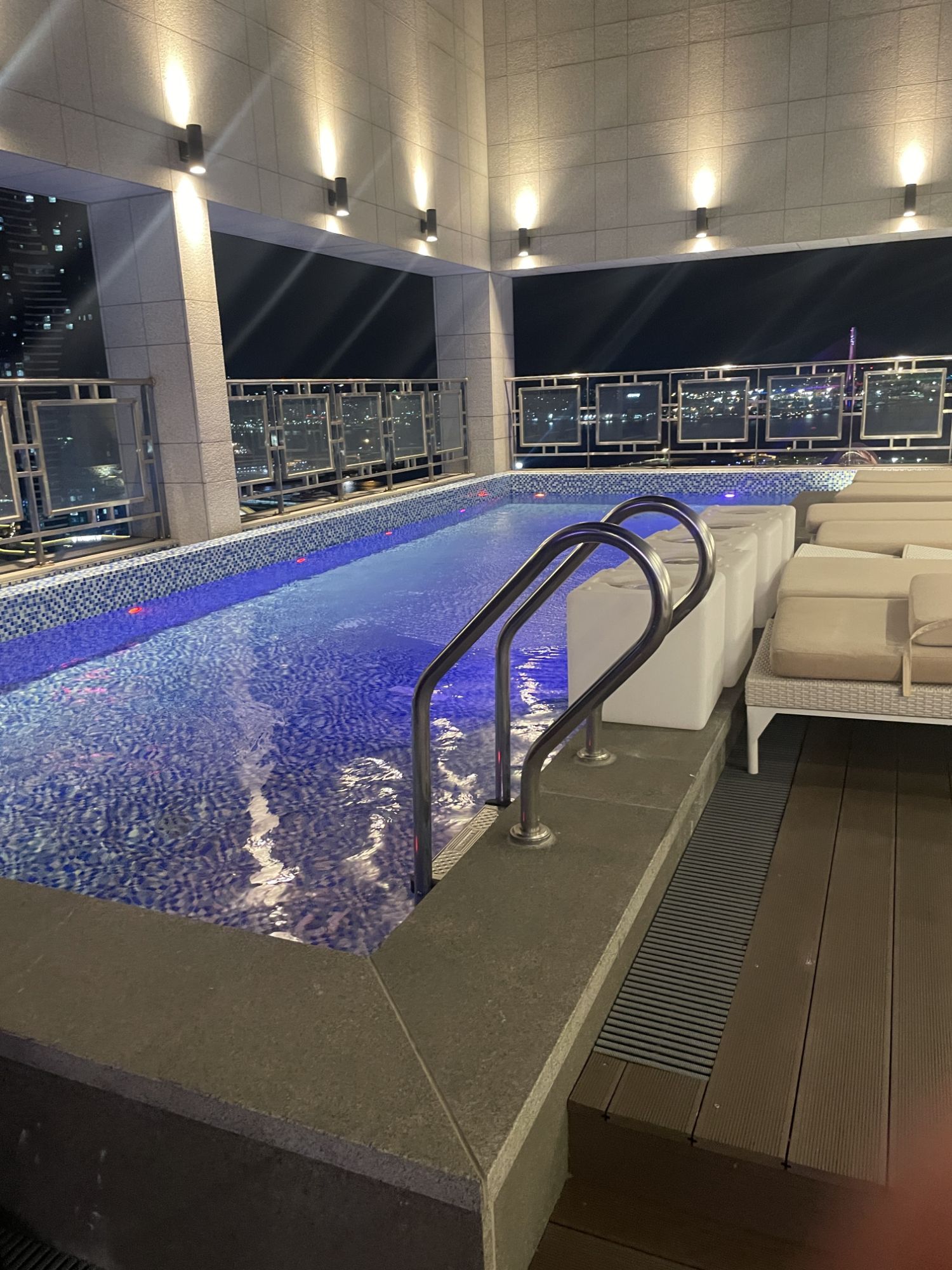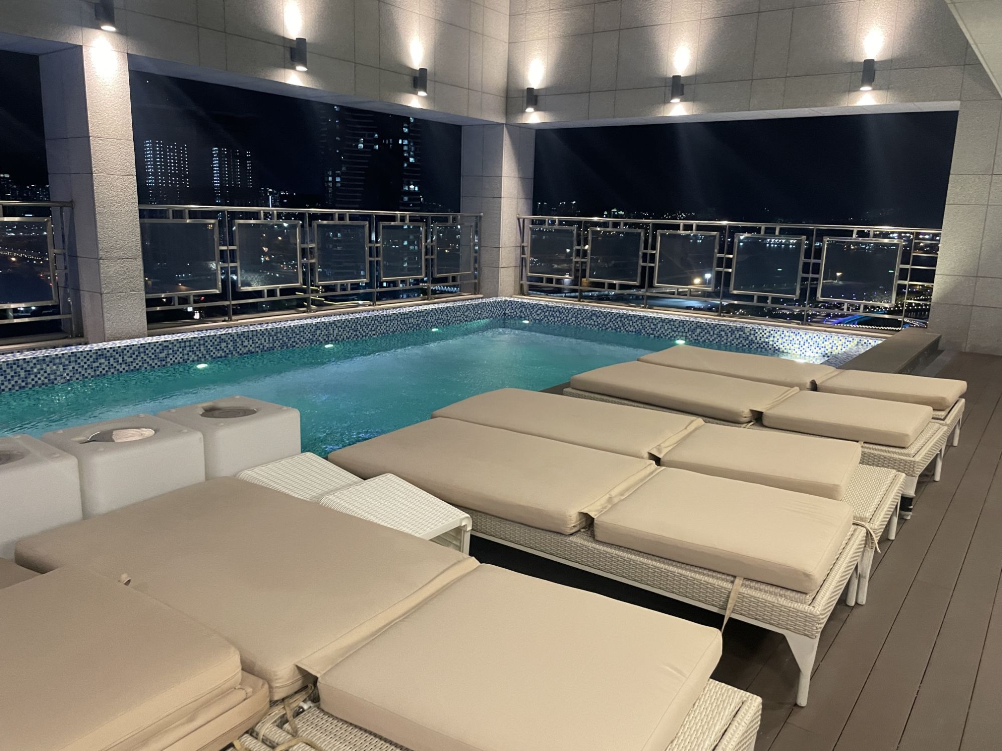 韓国出張の最後の夜は、特に印象に残っています。仕事のプレッシャーから解放され、リラックスした時間を過ごすことができました。夜のホテルのプールは、雰囲気はとても良く、誰も泳いでいませんでしたが、それがかえって静かな夜を演出していました。
